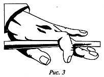 2) Положите шафт кия (ближе к наконечнику) поперек сустава большого пальца и поперек второго сустава среднего пальца (рис. 3).