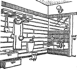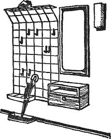 Для хранения обуви удобен низкий шкафчик, в верхней части которого укрепляют бруски или деревянные круглые палки, за которые обувь зацепляют каблуками (носки туфель и полуботинок упираются в деревянные планки). Дверцы в таких шкафчиках делать не обязательно. Их можно заменить занавеской из ткани. Верхняя плоскость шкафчика используется как полка, а на боковые его плоскости можно укрепить две скобки из металла или проволоки для хранения зонтов и тростей.