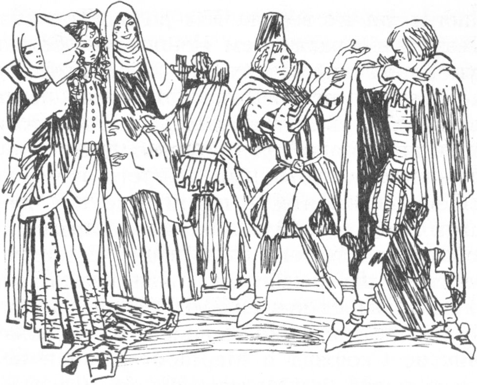 И вот все это великолепие вдруг остановилось возле сэра Ланселота-дитя. И добро бы сэр Галахад-дитя был один. Увы, девочки, повинуясь вечной страсти, которую испытывает слабый пол к изяществу и блеску, конечно же, сгрудились вокруг и с любопытством разглядывали счастливого обладателя костюма.