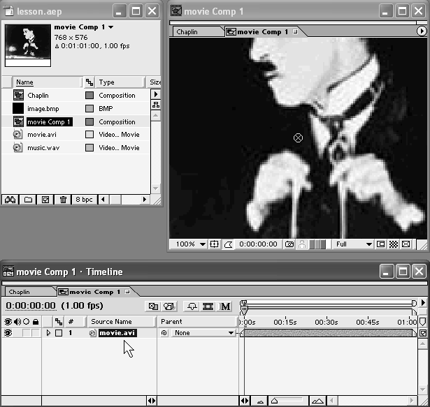 После того как вы отпустите кнопку мыши, новая композиция будет создана, причем, во-первых, ее установки будут идентичны установкам клипа movie.avi (без требования дополнительных подтверждений), и, во-вторых, эта композиция появится не пустой, а уже будет содержать слой movie.avi (рис. 4.10).