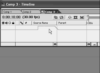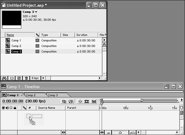 2. Схватитесь за название композиции Comp 3 в окне Project (Проект) и перетащите его в область слоев окна Timeline (Монтаж) (рис. 2.23).