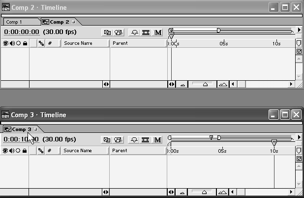 По мере создания новых композиций они будут открываться в окнах Timeline (Монтаж) и Composition (Композиция) при помощи организации соответствующих закладок. Для перехода от одной композиции к другой в том или ином окне необходимо щелкнуть на нужной закладке (рис. 2.18).