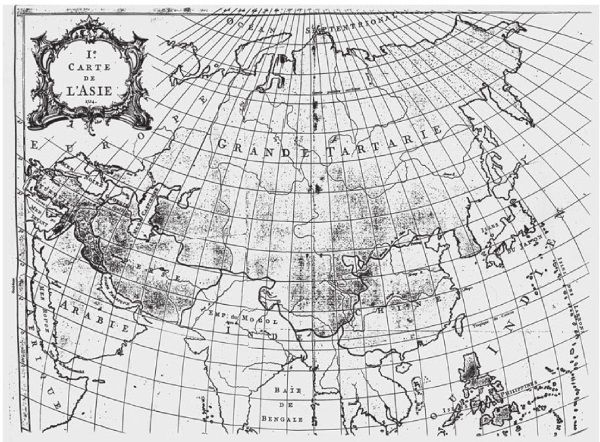 Рис. 1.24. Карта 1754 года «I-e Carte de l’Asie» из Атласа 1755 года. Это фактически та же карта, что и «II-e Carte de l’Asie». Здесь лишь отсутствуют более мелкие надписи. Через всю Россию идет огромная надпись GRANDE TARTARIE, то есть Великая Тартария или Монголо-Татария. Взято из [1018]