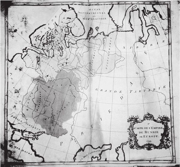Puc. 1.25. Карта Российской империи и Европы, «I-e Carte de l’Empire de Russie en Europe. 1755». Через всю страну идет надпись GRANDE TARTARIE, то есть Великая Тартария. Взято из [1018]