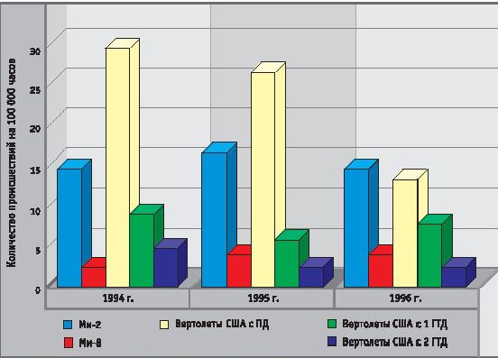 На рис. 1 показана статистика авиационных происшествий (АП) с российскими вертолетами Ми-2 и Ми-8, а также с вертолетами США за период с 1994 по 1996 гг. Материалы взяты из статьи Р.А. Теймуразова и В.Е. Овчарова (журнал «Вертолет» № 1, 1998 г.) и с Интернет-сайта NTSB.