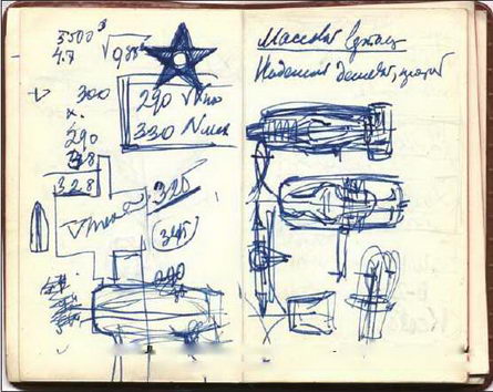 Дневник М. Л. Миля 1965 года… На левой странице — параметры скорости Ми-24, на правой — схема мотора и возможности увеличения его мощности