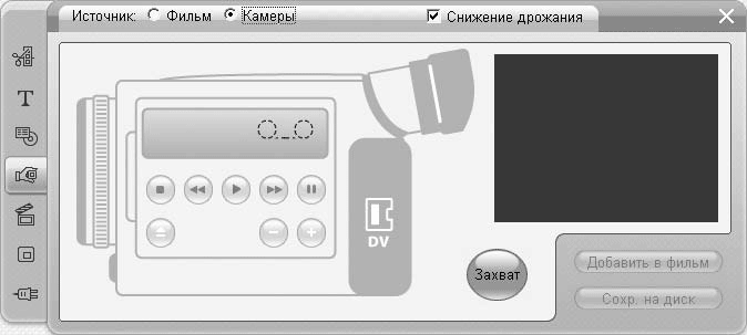 С помощью кнопок, имитирующих элементы управления камерой, вы сможете перемотать отснятое камерой видео на нужное место. После этого следует захватить и сохранить кадр точно так же, как при захвате кадра из фильма (проекта).