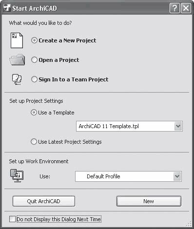 Если установить флажок Do not Display this Dialog Next Time (Не показывать этот диалог при следующем запуске), то при запуске ArchiCAD это окно не появится. Создать новый проект, открыть существующий, выбрать шаблон и профиль можно с помощью соответствующих инструментов рабочей среды ArchiCAD.