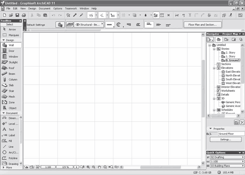 Установите переключатель открытия проекта в положение Create a New Project (Создать новый проект) и щелкните на кнопке New (Новый). Через некоторое время на экране появится рабочая среда программы ArchiCAD (рис. 1.23).