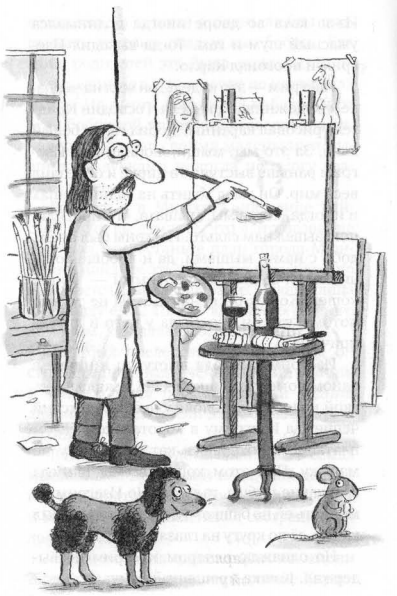 Изегрим — это пудель, он жил на чердаке, у художника Крингеля. Господин Крин- гель рисовал картины, любил сыр и белый хлеб. За это мы, мыши, любили его. Изегрим раньше выступал в цирке и объездил весь мир. Он умел ходить на задних лапах и иногда, когда мы, мышата, его просили, показывал нам сальто. Изегрим был очень добр с нами, мышами, да и вообще хорошо ладил со всеми животными — кроме кошек. Кошек он ненавидел. И не только потому, что он пёс. Была у него и другая причина.