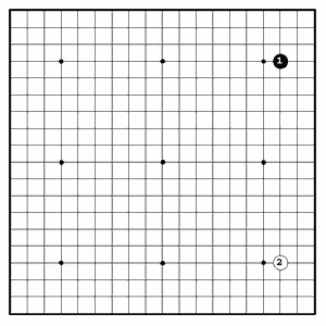 Что за фусэки изберёт Седьмой дан, новое или старое? Куда пойдет в хоси или в комоку? Весь мир ждал, какой ход сделает Седьмой дан. Первый ход чёрных был в пункт 3-4 (комоку) в правом верхнем углу. Это означало, что избрано старое традиционное начало. Итак, первая загадка в этой партии была разрешена.