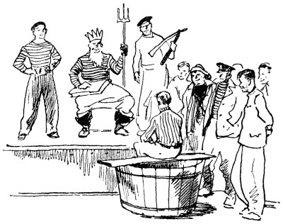 Мне для начала прочли длинную проповедь, затем посадили на доску, положенную поперёк ушата, и побрили деревянной бритвой длиной в полметра. Пока адъютант Нептуна скоблил мне левую щёку, из-под меня выбили доску. Я совсем этого не ожидал и потому, упав в ушат, наглотался солёной воды. Не успел я откашляться, как Нептун с адъютантом уже исчезли.