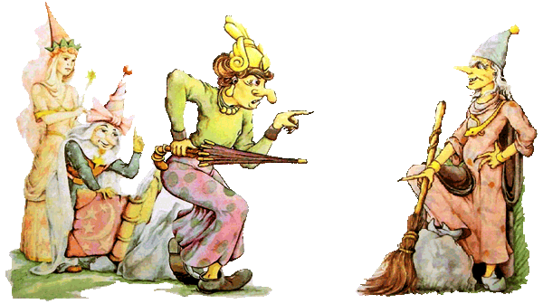 Внезапно Гингема превратилась в страшную, сгорбленную старуху, вскочила на помело и взмыла в воздух. Солдаты побросали оружие и со страху попадали на землю.
