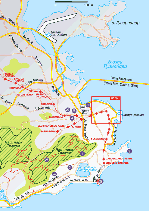 Центральный автомобильный вокзал Rodoviaria Novo Rio находится в нескольких километрах к северо-западу от Centro. В этом районе, на берегу моря есть еще один аэропорт – Santos Dumont, но большие самолеты он не принимает.